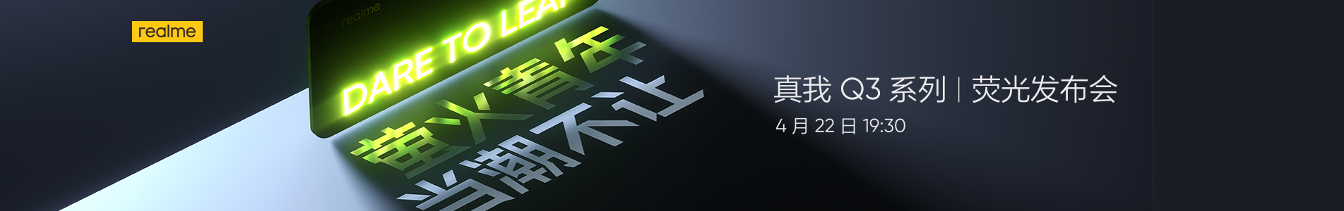 4 月 22 日 19:30 ,#真我Q3荧光发布会#,延续Q系列百万爆款基因,全新一代“千元机皇”正式登场!