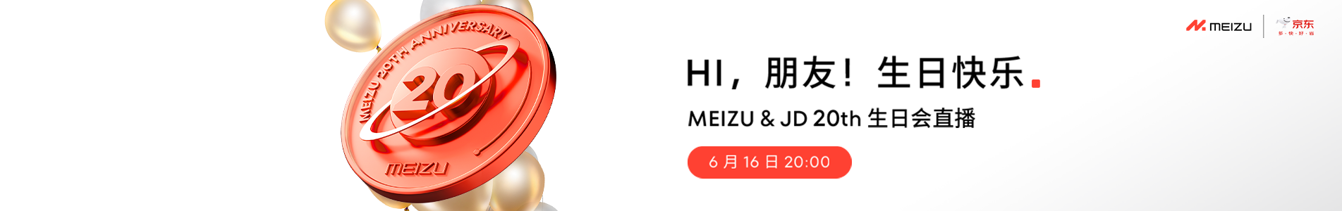 MEIZU & JD 20th 生日会直播活动 热爱同行 20 周年,MEIZU & JD 20th 生日会直播活动,6 月 16 日 20:00 全网多平台同步直播,与你一起回顾经典,共赴未来。 视频直播