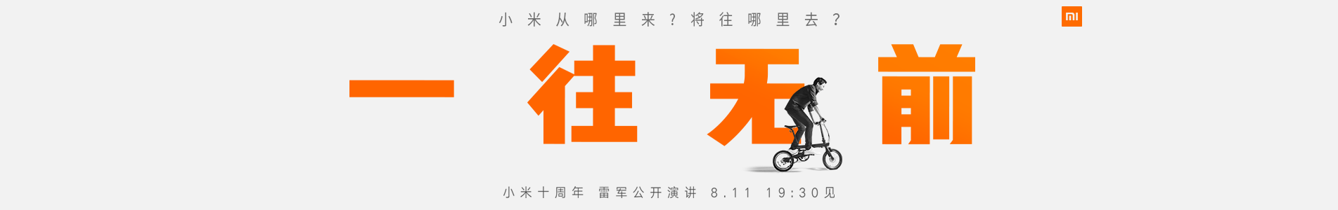 【一往无前】小米十周年 雷军公开演讲 小米十周年雷军公开演讲,主题演讲时间:将于8月11日晚19:30举行,活动地点:北京·小米科技园。从一碗滚烫的小米粥,到世界最年轻的五百强。这十年,风很大,坑也不少,小米公司走过了精彩又刺激的十年。站在十年的节点再次发问:小米从哪里来?将往哪里去? 视频直播